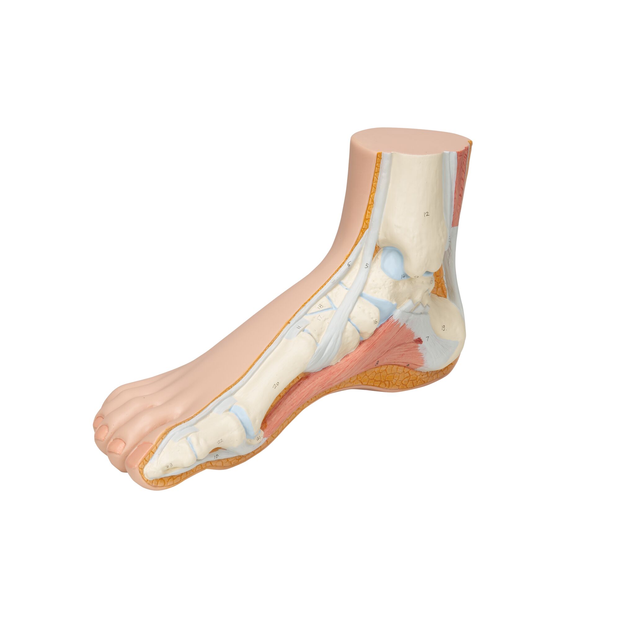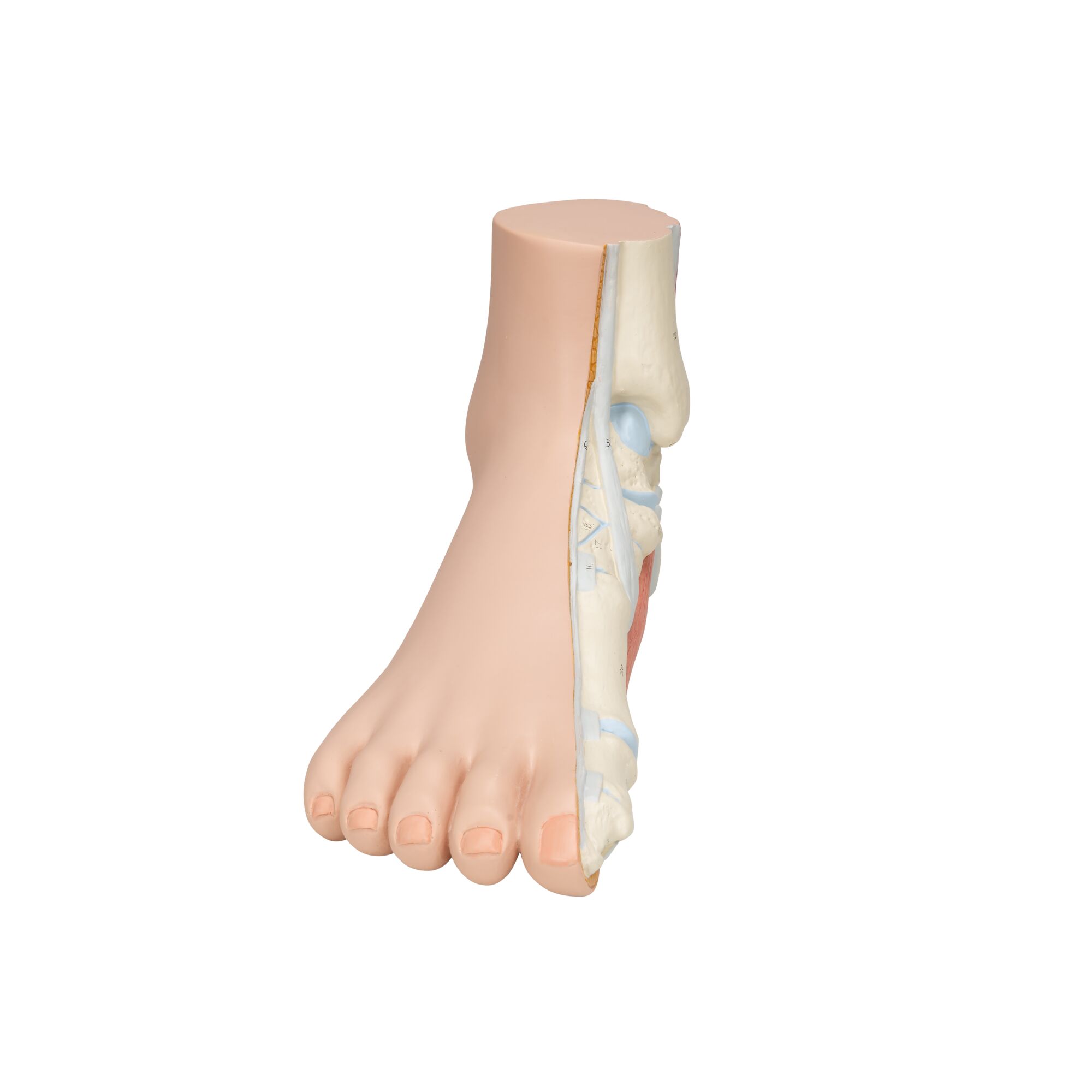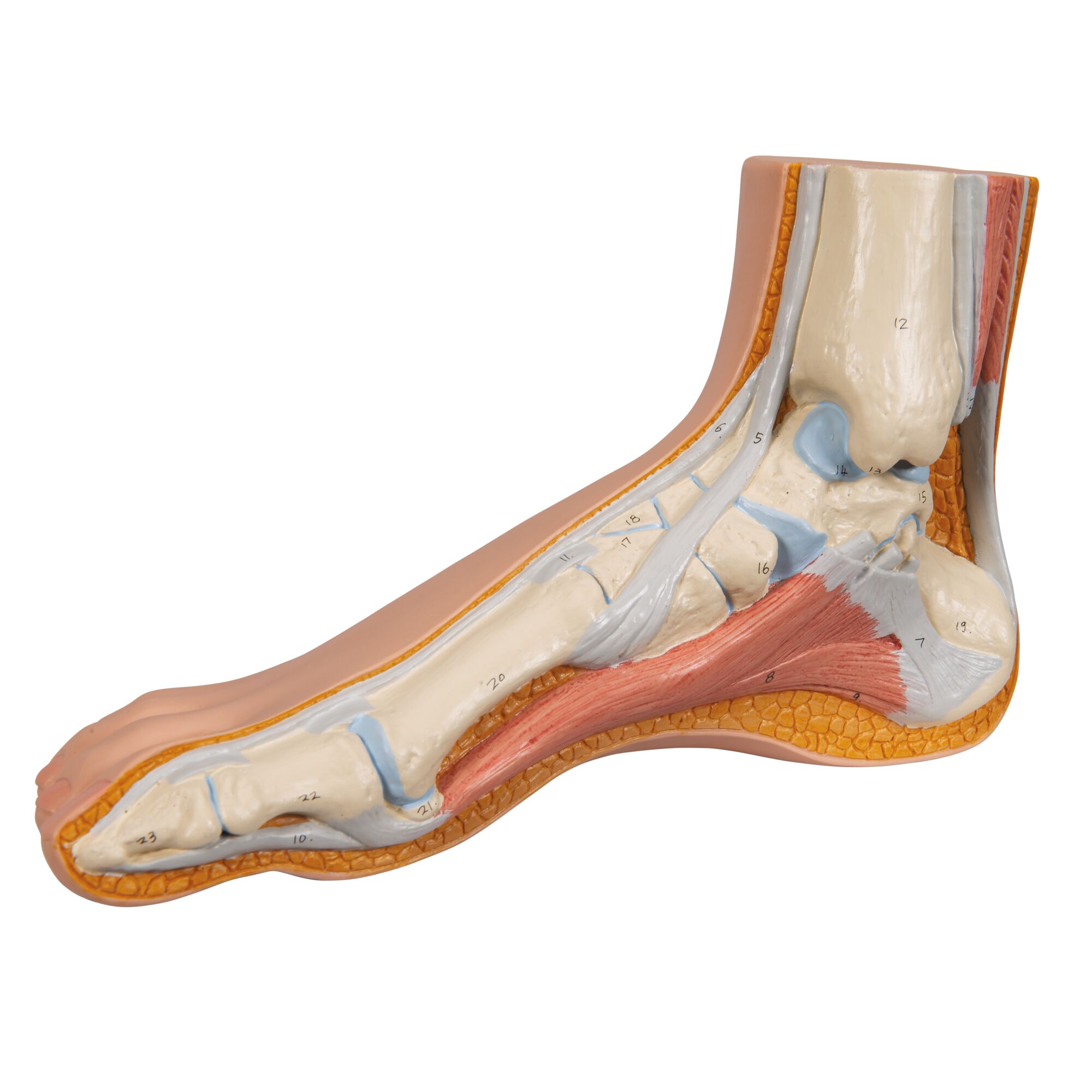 Dit anatomiemodel is een doorsnede van de normale voet. De interne botten, spieren, ligamenten en zenuwen zijn hierop zichtbaar. Het model kan als een prachtige referentie (normaal) worden gebruikt voor de ‘Platvoet’ en de ‘Holvoet’ (beiden tevens afzonderlijk verkrijgbaar). Onmisbaar in de praktijk en het onderwijs.