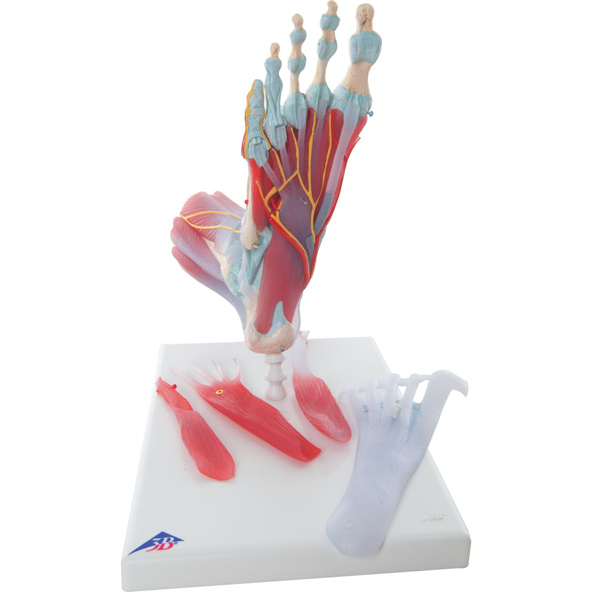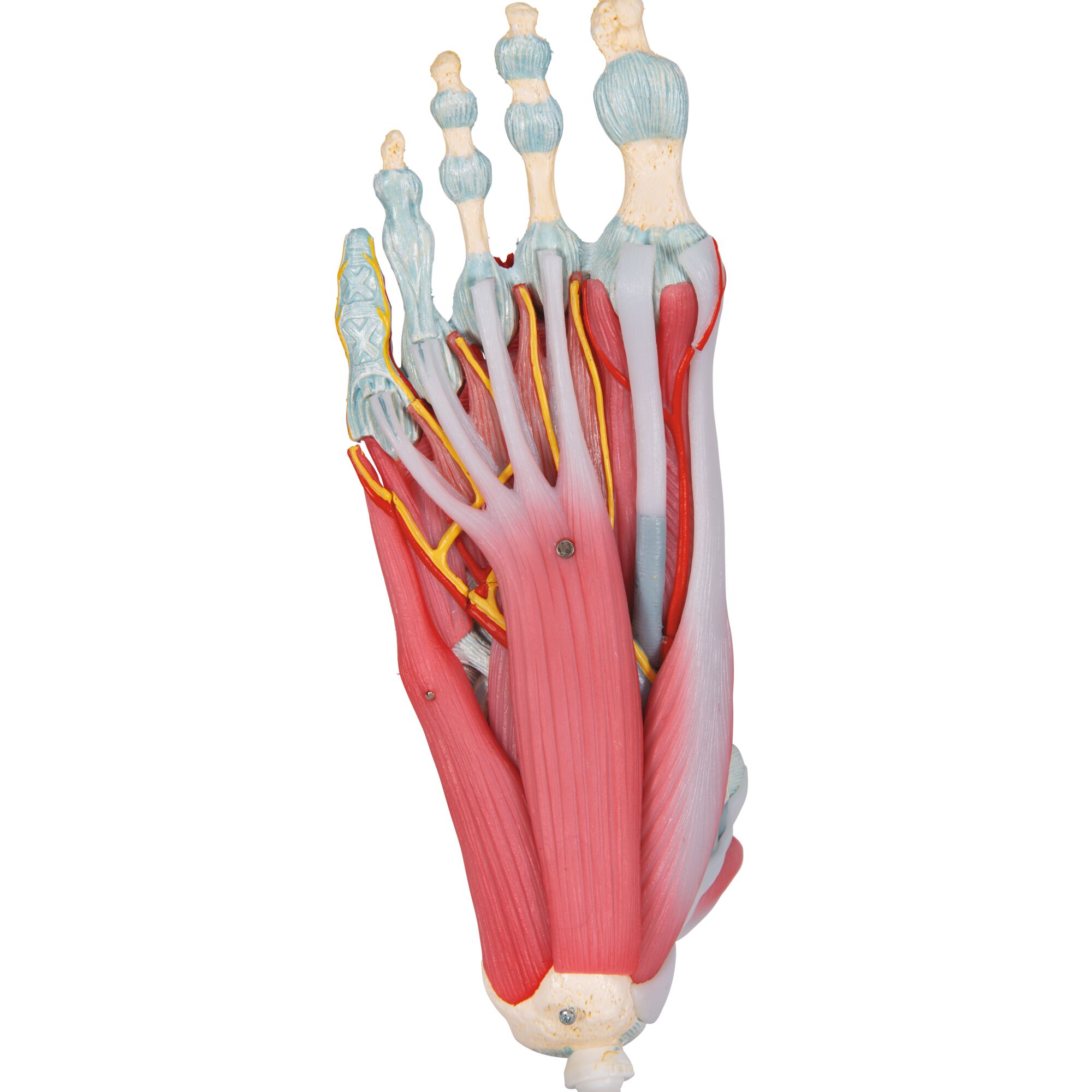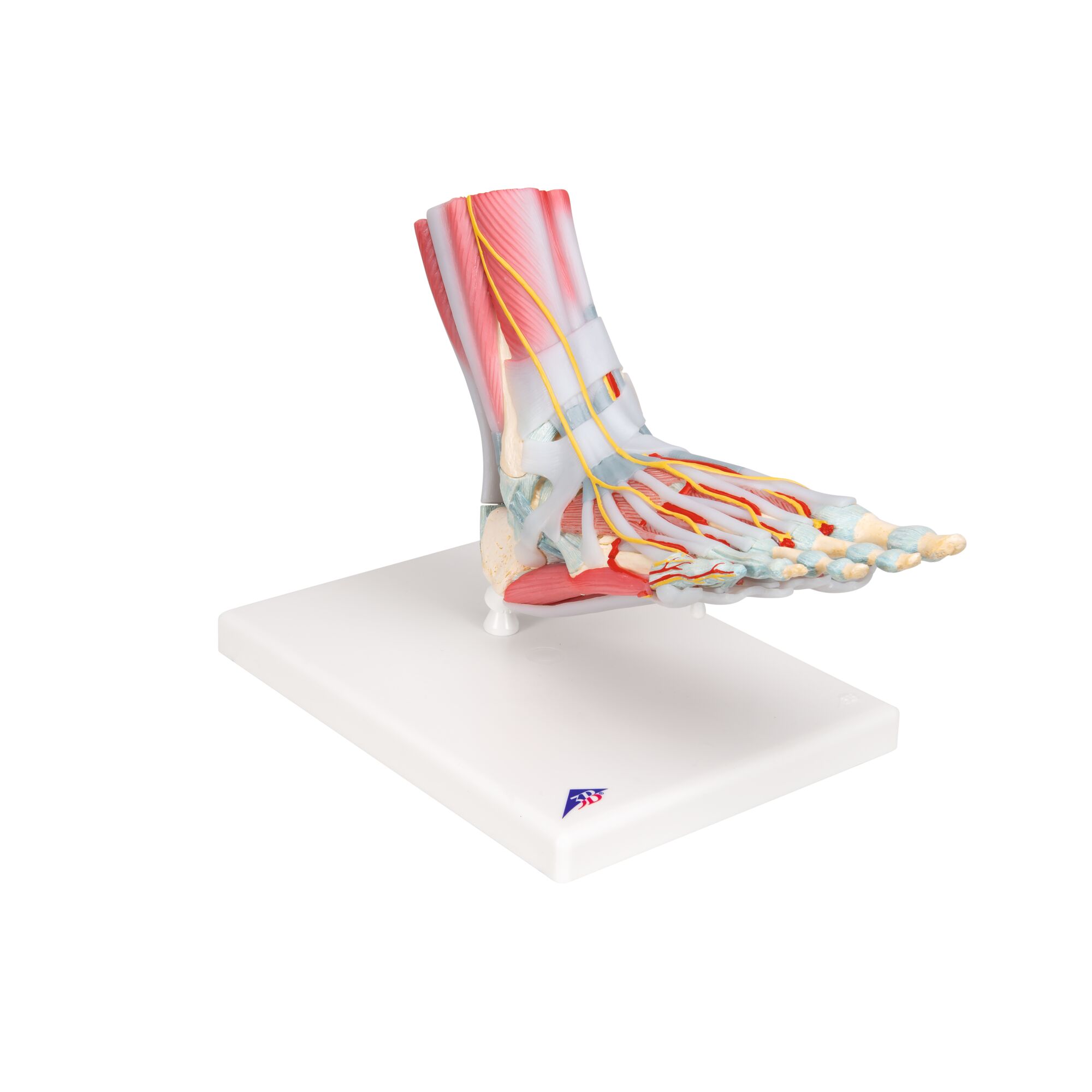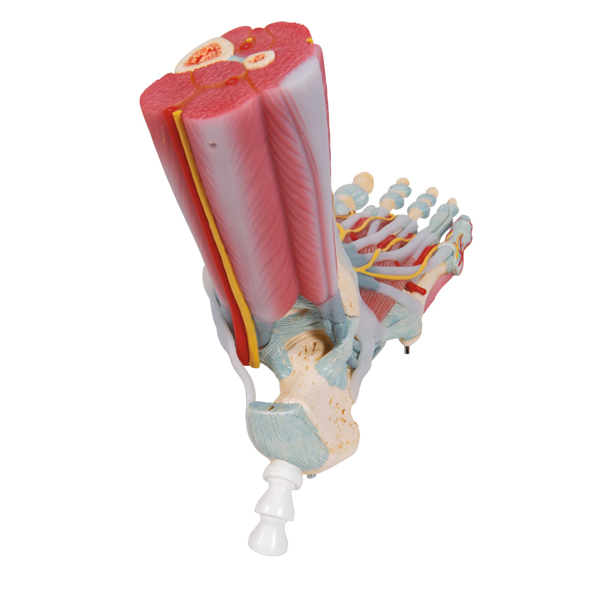 Model met gedetailleerde anatomie van de voet, enkel. Bevat 6 losse onderdelen. Het model laat naast de botten ook de spieren, pezen, gewrichtsbanden, zenuwen, slagaders en aders van de voet en enkel zien. De strekspieren van de (voor)voet zijn zichtbaar, waarvan de pezen gevolgd kunnen worden onder de dwarse enkelbanden tot aan de aanhechtingen. Daarnaast zijn de peesomhulsels van de voet zichtbaar. De kuitspier is in delen te verwijderen, waardoor zicht is op de onderliggende structuren. De voetzool is in 3 lagen te bestuderen. Eerste laag: de korte teenbuigers (m. flexor digitorum brevis), tweede laag: de vierkante voetzoolspier (m. quadratus plantae), derde laag: de pezen van de lange teenbuigers (m. flexor digitorum longus) en de buiger van de grote teen (m. flexor hallucis). Het model is zeer geschikt voor gedetailleerde studie en instructie. Inclusief een standaard.